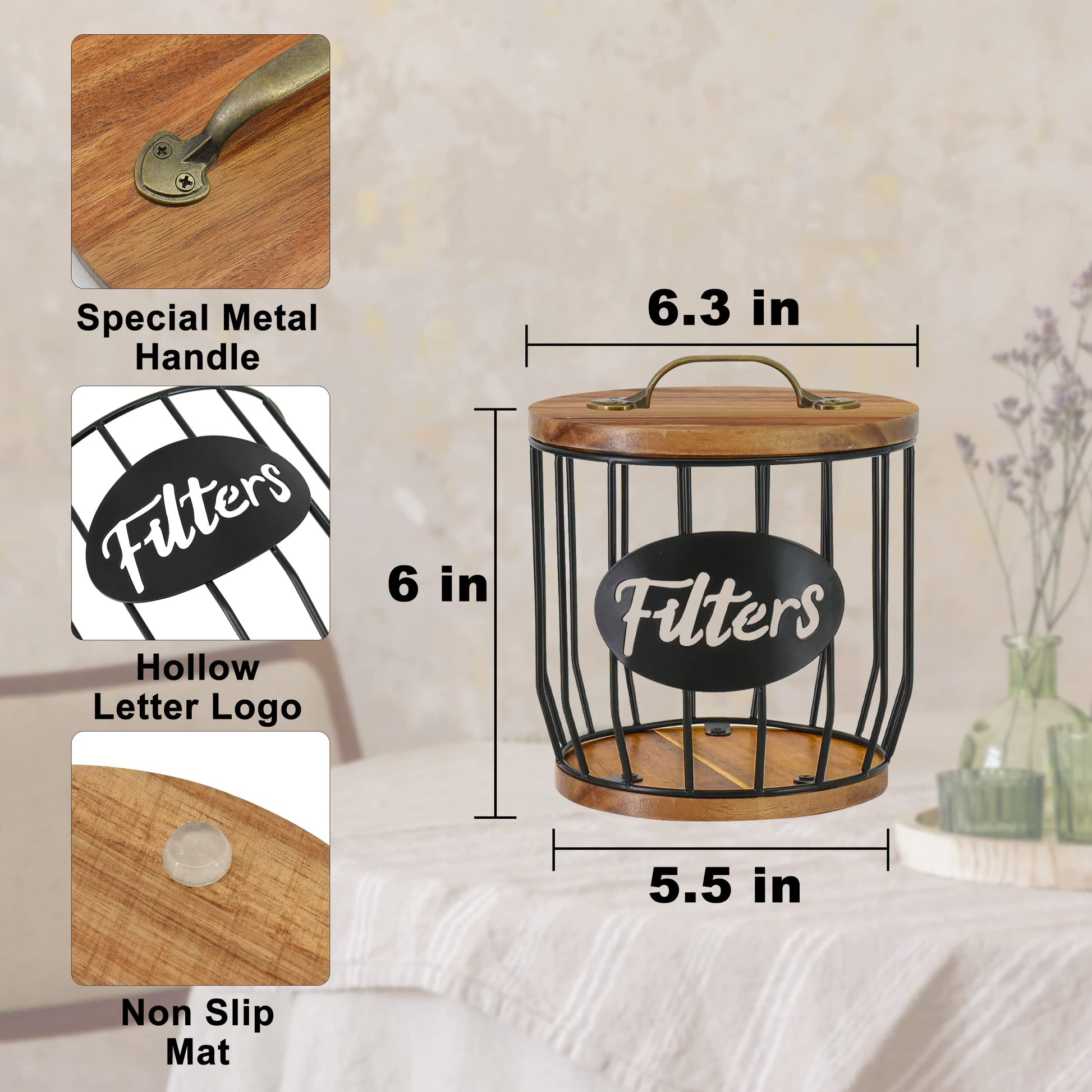 This elegant coffee filter holder combines metal and acacia wood for a charming farmhouse aesthetic. Designed to accommodate most common round basket-shaped coffee filters, it offers both style and functionality for your coffee bar or kitchen counter.